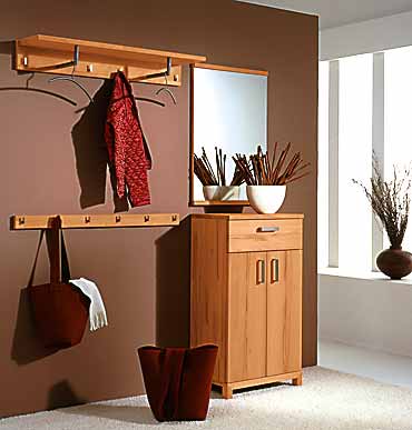 Programm 115 in Rotkernbuche, geölt, Kombination 115-906 bestehend aus einer Kommode mit Schubkasten und 3 Drahtrosten B/H/T: 58/107/38 cm, Hutablage mit 2 Querstangen und 4 Haken, Knopfleiste mit 6 Haken, B 103 cm, Spiegel 58 x 86 cm.