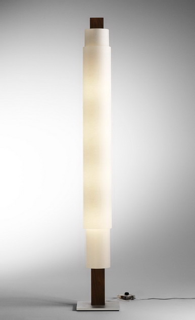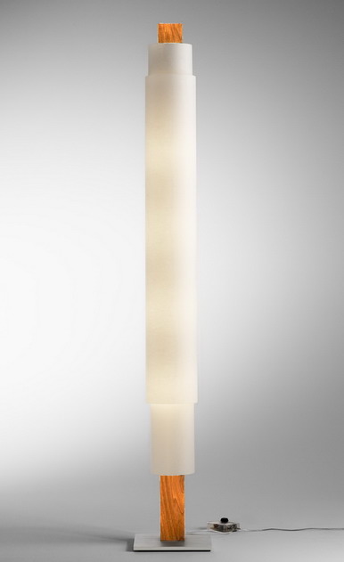 Der aus massivem Edelholz gearbeitete Leuchtenkörper ruht auf einer quadratischen Stahlplatte. Die Leuchte wird in zwei unterschiedlichen elektrischen Versionen angeboten. 1) mit vier E27-Fassungen und Fußdimmer für normale Glühlampen und Hochvolt-Halogenlampen. 2) die Leuchte ist ausgestattet mit zwei hocheffizienten T5 Leuchtstofflampen. Auf der Rückseite der Leuchte befindet sich ein Taster, mit dem die Helligkeit stufenlos reguliert werden kann. Die Lieferung erfolgt inklusive der passenden Leuchtstofflampen in der Lichtfarbe warmweiß.