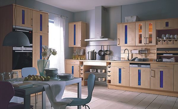 Marmoriertes Glas in kühlem Blau – mundgeblasen – verleiht dieser Naturholz-Küche ihren eleganten, einzigartigen Charakter. Kompromisslos in Design und Qualität präsentiert sich Alicante als Planungswunder für jeden Grundriss.